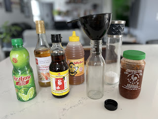 To make the dressing, combine the lime juice, honey, rice vinegar, 1 teaspoon sesame oil, 1/4 teaspoon chili garlic sauce and season with salt in a jar with a tight-fitting lid. Shake well. Set aside.