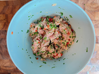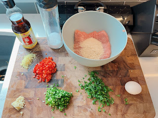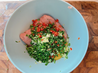Combine the ground chicken, panko, green onions, bell pepper, cilantro, 1 tablespoon ginger, garlic, egg, sesame oil and season with salt in a large bowl. Mix until combined.