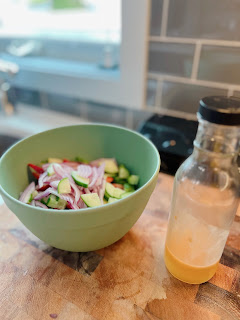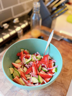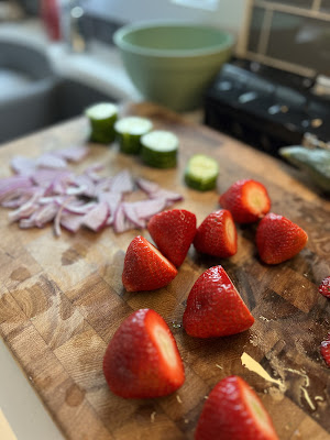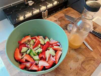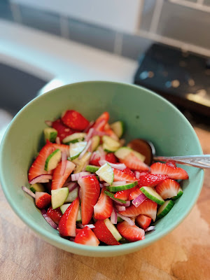 Combine the cucumbers, red onion and strawberries in a medium-size bowl. Drizzle the dressing over the top and toss gently to coat. Set aside.