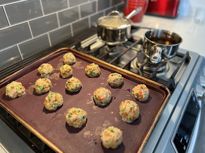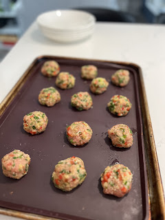 Scoop up the mixture into 1 ½ inch balls and arrange them on the baking sheets, spaced about 2 inches apart. If you have time, refrigerate the meatballs for 30 minutes. You could also freeze the meatballs at this point.
