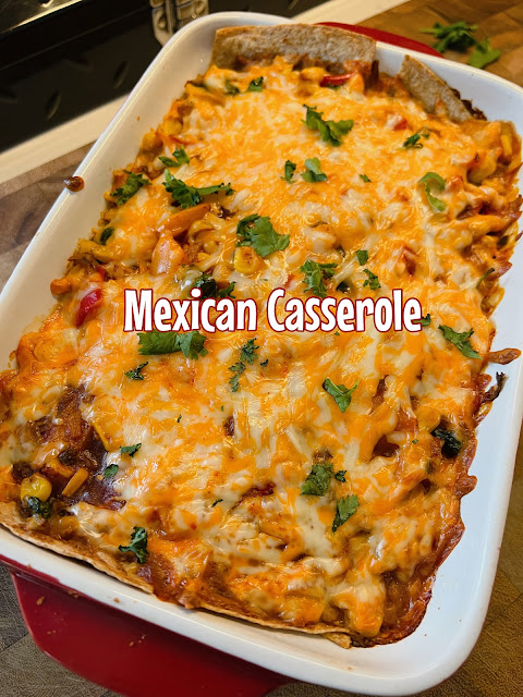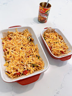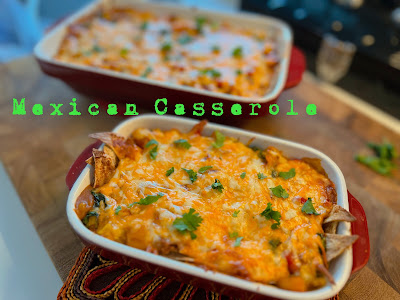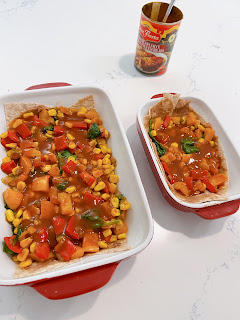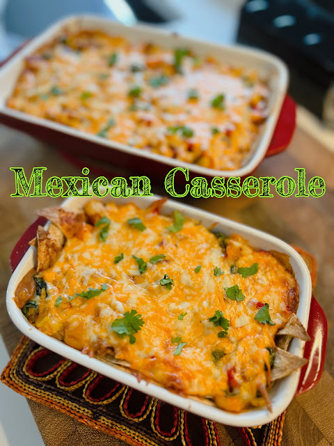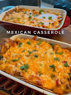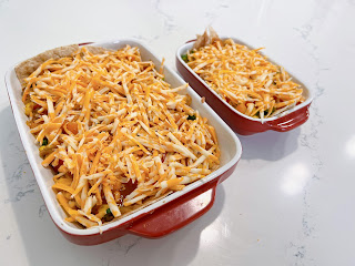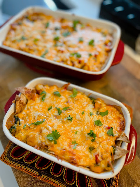 Layer in order: half of the bean covered tortilla strips, half of the veggies, half of the sauce, half of the cheese. Cover with the other half of the tortilla strips, veggies, sauce, and cheese.