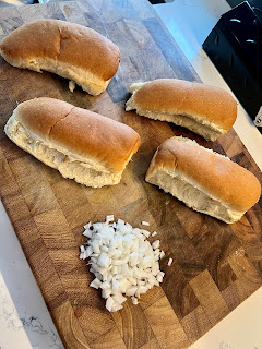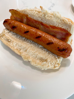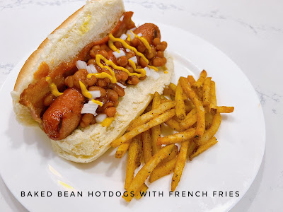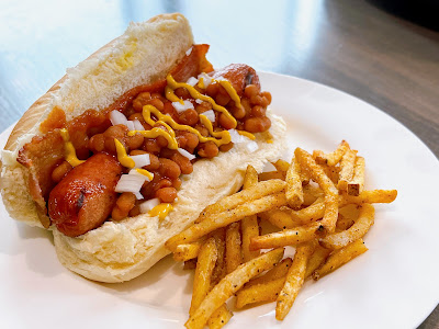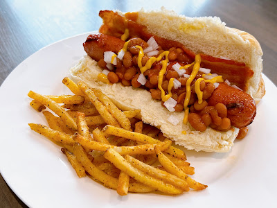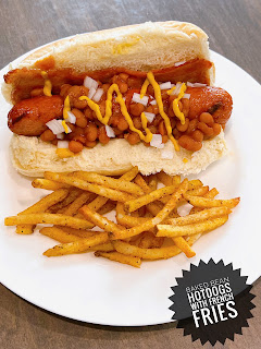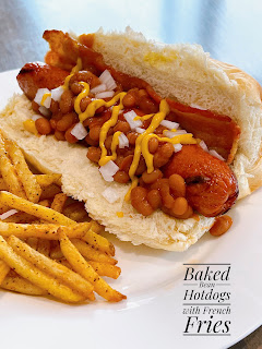 BBQ hot dogs and then place in buns with a slice of bacon each. Top each hotdog with baked beans, onion and yellow mustard. Serve with fries.