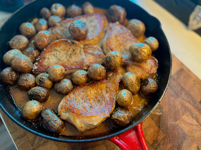 Return the potatoes and pork chops to the skillet and toss in the sauce. Serve with broccoli on the side.