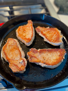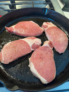 Using the same skillet, add another tablespoon olive oil and pork chops. Cook for 4-5 minutes per side, until cooked through. Set aside on a plate and cover with aluminum foil to rest.