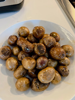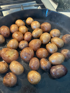 Heat 1 tablespoon of the olive oil in a large skillet and cook the baby potatoes until the skin in golden brown. Set aside.