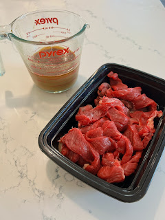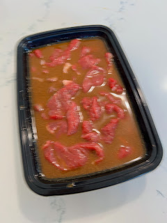Add soy sauce, chicken broth, rice wine vinegar, corn starch, ginger, black pepper to a ziplock bag and shake to combine. Add the steak and gently toss to combine. Refrigerate for at least 15 minutes.