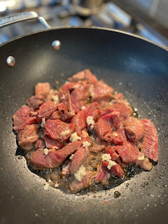 Heat 1 tablespoon oil in a large saute pan over medium-high heat. Remove steak from marinade with a slotted spoon, reserving the marinade, and add to saute pan with garlic. Saute for about 2-3 minutes until browned, stirring occasionally. Remove steak with a slotted spoon and set aside.
