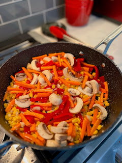 Place the pan with the bacon grease over medium heat. Add garlic, onion, carrot, corn, mushrooms and bell pepper and sauté for 2 minutes.