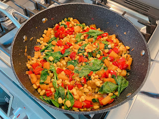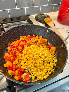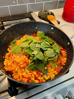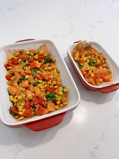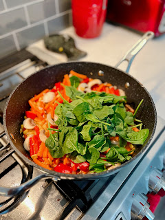 Heat a large nonstick skillet with a little bit of oil over high heat. Add the onion and peppers and corn, sprinkle with chili and cumin, and stir until browning on the outside of the veggies. Add spinach (if using) and stir until wilted. Sprinkle the roasted veggies with a little bit of salt and toss to coat. Set aside.
