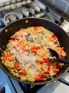 Add the spinach and cook until the spinach wilts, about 2 minutes. Add the cooked orzo back into the pan and turn the heat to low. Stir in the reserved pasta water, parmesan, garlic powder and red chili pepper flakes.