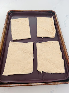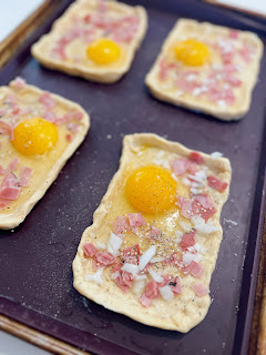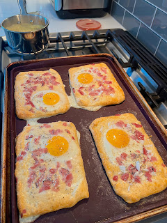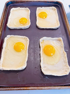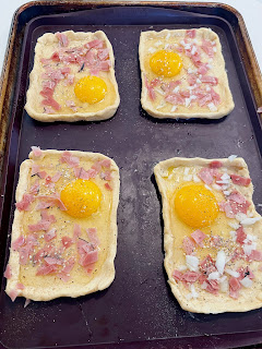 eal the perforations to make 4 complete rectangles. Add the rectangles to a cookie sheet sprayed with non stick spray or a baking mat. Roll the edges of each rectangle to make a border. Crack an egg into each one carefully. Use a pastry brush and brush the edges with some of the egg whites that are in each pastry. Add the ham to each rectangle. Season with salt, pepper, and dried herbs of your choice.Make the hollandaise sauce according to the package directions.
