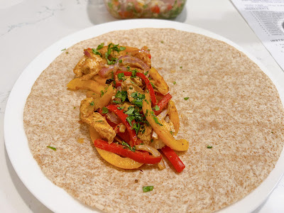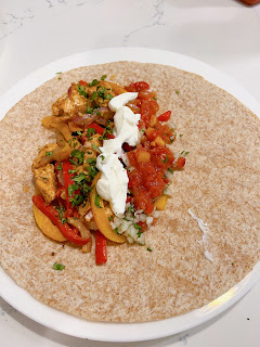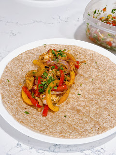 Microwave tortilla wraps for 15 seconds, top warm tortillas with fajita mix, cilantro, sour cream and salsa.