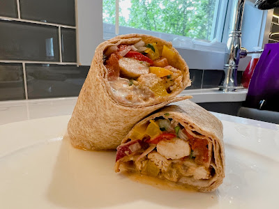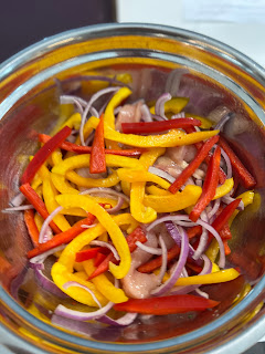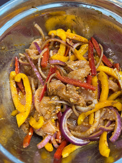 In a bowl, combine the olive oil, lime juice, seasonings, and garlic. Mix in the chicken, bell peppers, and onion.