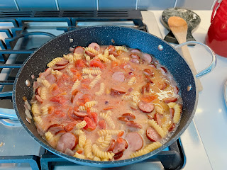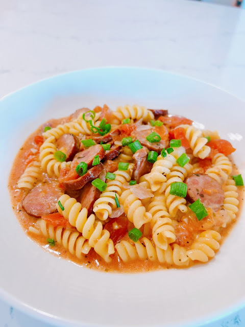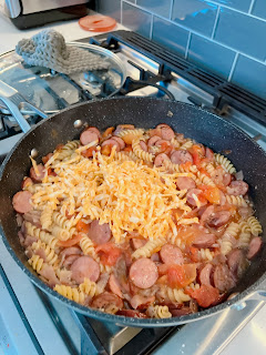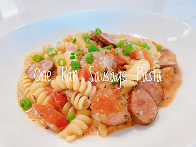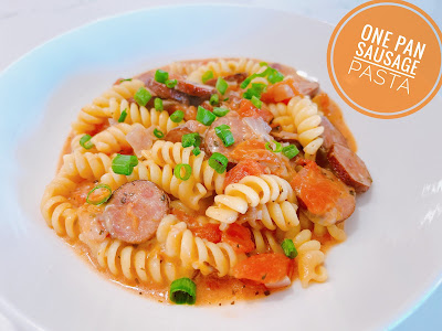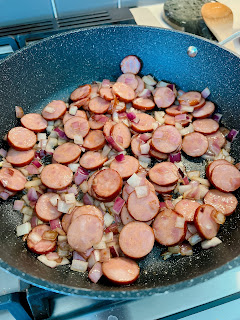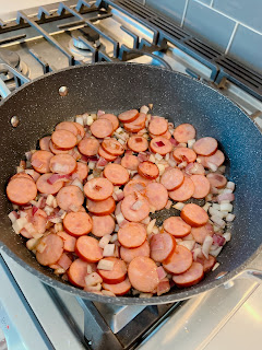 Add sausage and onions to the pan, cook for about 5-7 minutes, stirring occasionally. The onions should be soft and the sausage starting to brown. Add garlic and cook for 1 minute.
