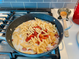 Mix in tomatoes, pasta, Tobasco Sauce, chicken stock and milk. Stir, season with salt and pepper and bring to a boil. Reduce heat, cover and cook for 12-15 minutes until the pasta is cooked.