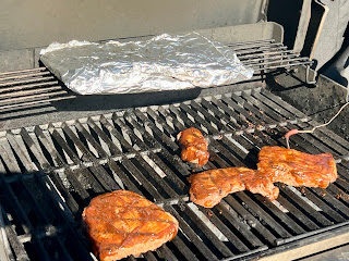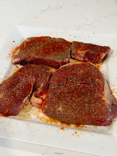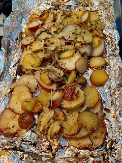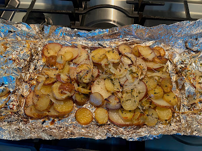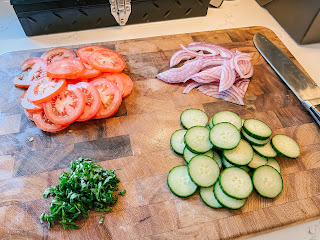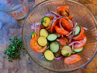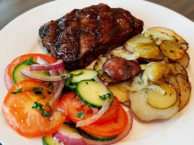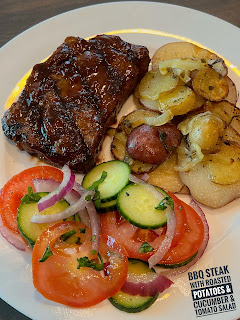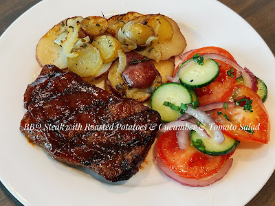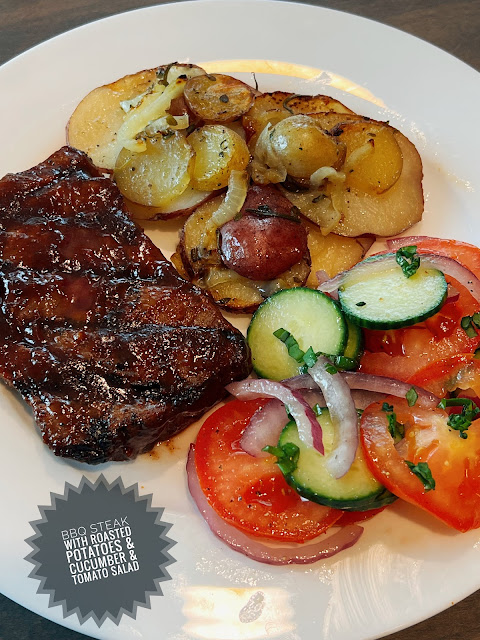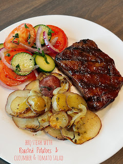 Sunday: BBQ Steak with Roasted Potatoes & Cucumber and Tomato Salad with Red Onions