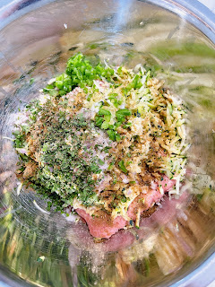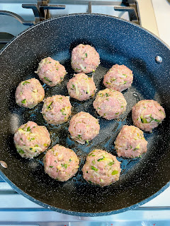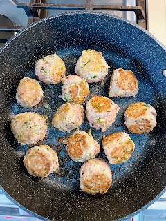 In a large bowl, add the ground turkey, shredded zucchini, egg, breadcrumbs, onion, cilantro, 1/2 jalapeño, garlic, cumin and salt and pepper. Use clean hands to mix and form into 16 golf ball sized meatballs.