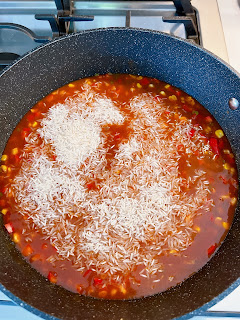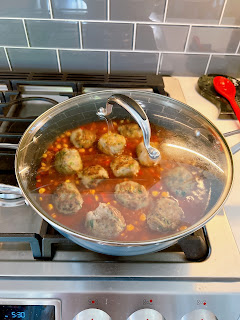 Reduce heat to medium-low and add in the other half of the jalapeño pepper, bell pepper and corn. Saute for a minute, then add in the enchilada sauce and chicken stock. Bring sauce to a simmer, then fold in the rice, making sure it is evenly distributed. Add the browned meatballs on top. Cover the pan, reduce heat to low and simmer for 25-30 minutes or until rice is soft.