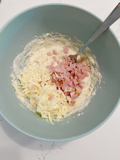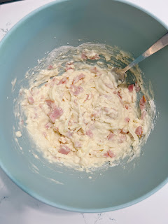 In a large bowl, stir together the 2 cups of flour, baking powder and salt. Mix in the eggs, milk and melted 1/4 cup of butter until just combined. Fold in the diced ham and 1 cup of cheese.