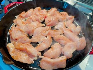 Heat 2 tablespoons of oil on medium heat in the same, cast-iron skillet. Add the chicken in one layer and cook, undisturbed, for about 4 minutes.