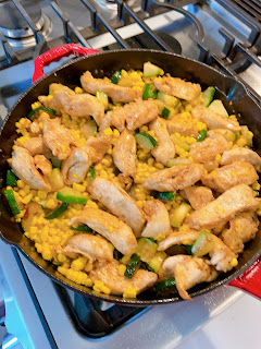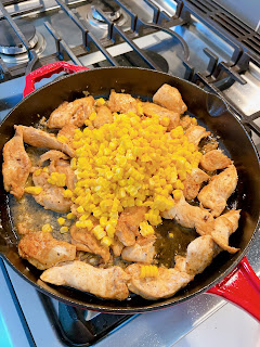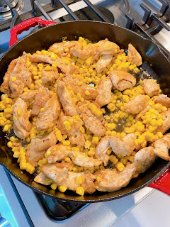 Add the chicken broth and corn kernels to the skillet and bring to a simmer.