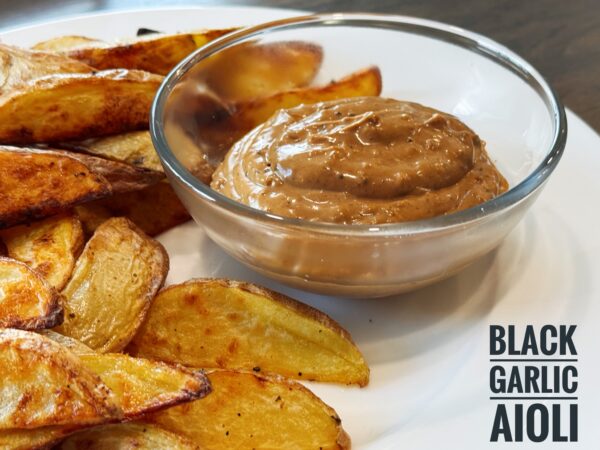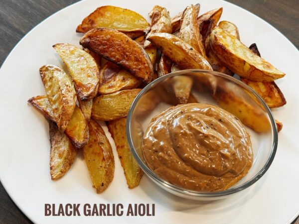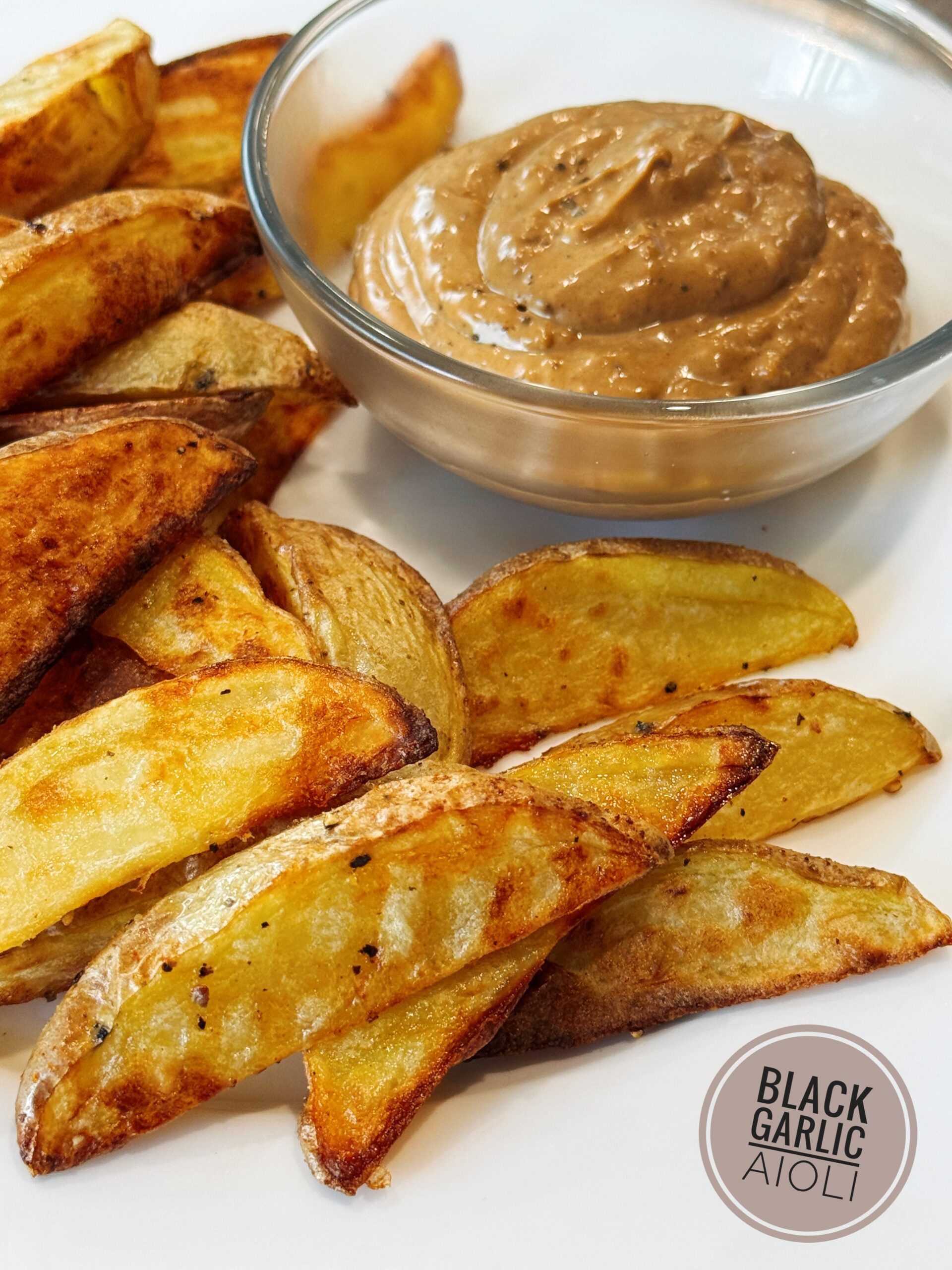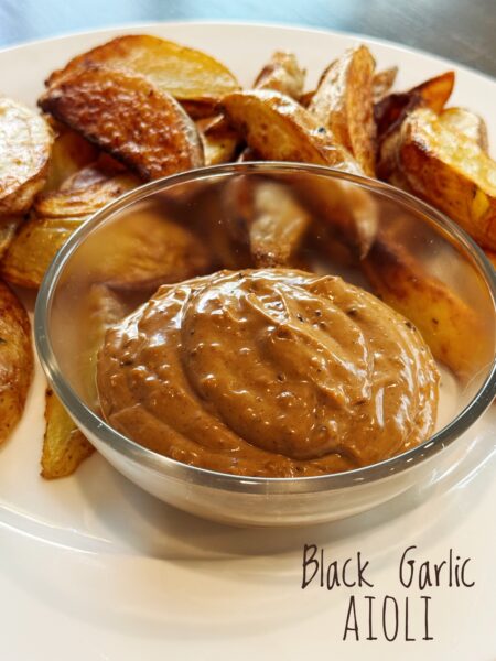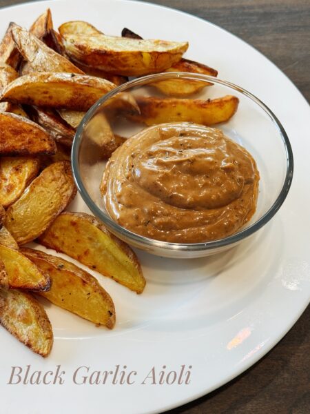 We have a restaurant in town called Orolo. They have a dip for their fries that is to die for. My Dad and I LOVE it! My Sis bought me some dried black garlic so I could try making it at home and, I did! This Black Garlic Aioli tastes almost exactly like the dip from Orolo!! I made it for my Dad and we both had heartburn from all the garlic for days… in the best way possible lol. We had them with Seasoned Air Fried Potato Wedges and YUM!