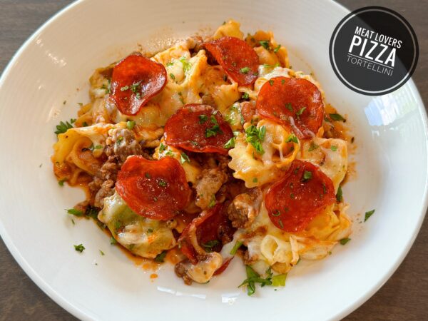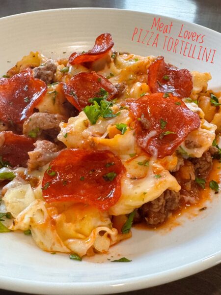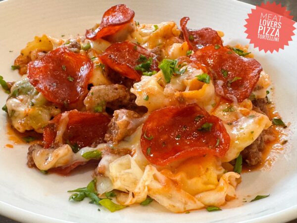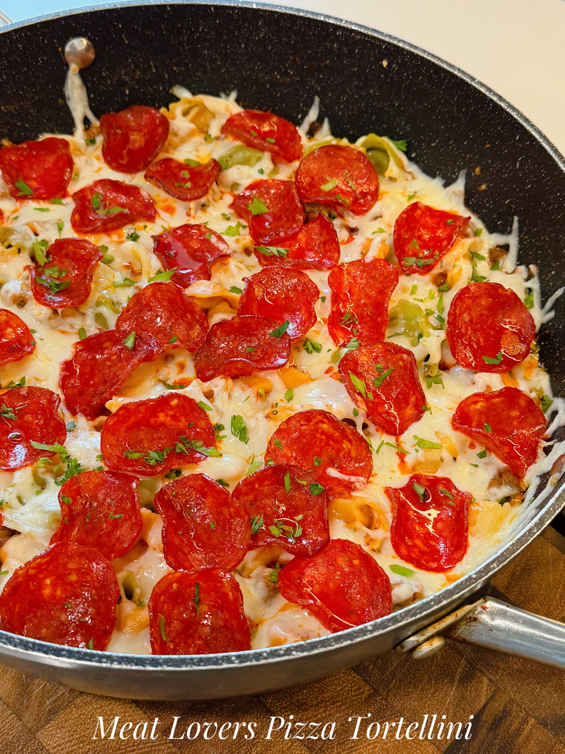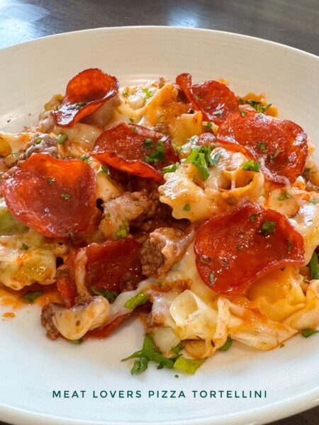 Ninja loves pizza. When we first started dating, we ate a LOT of pizza. We MET working at a pizza place! Lol I’m basic, I like cheese pizza. Actually I love a white pizza which really goes against everything Ninja stands for when it comes to pizza lol. He loves pizza sauce and the more toppings the better! He especially loves a pizza filled with meat! I combined his favourite pizza with his favourite pasta and we had this delicious Meat Lovers Pizza Tortellini for dinner! It was a BIG winner!