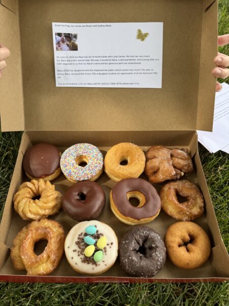 On June 20, we spread love through our community in Mom‘s name. My Mom, Kathy Castle, loved doughnuts and had a great respect for our public education system. HBear and I spread community kindness by delivering a dozen doughnuts to each of the 6 school administrations that have played such an important part in HBear and SBean’s lives over the last 12 years.