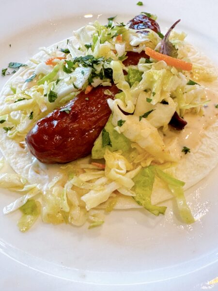 • Spread on a couple tablespoons of peppercorn sauce onto tortillas, place a sausage on top of the sauce, then pile on the coleslaw. Top with cilantro.