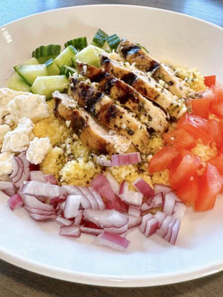 • Divide the cooled couscous among bowls. Top with the grilled chicken and prepped cucumbers, tomatoes, and red onion. Add the feta cheese into the bowls separately and drizzle with the remaining untouched dressing.