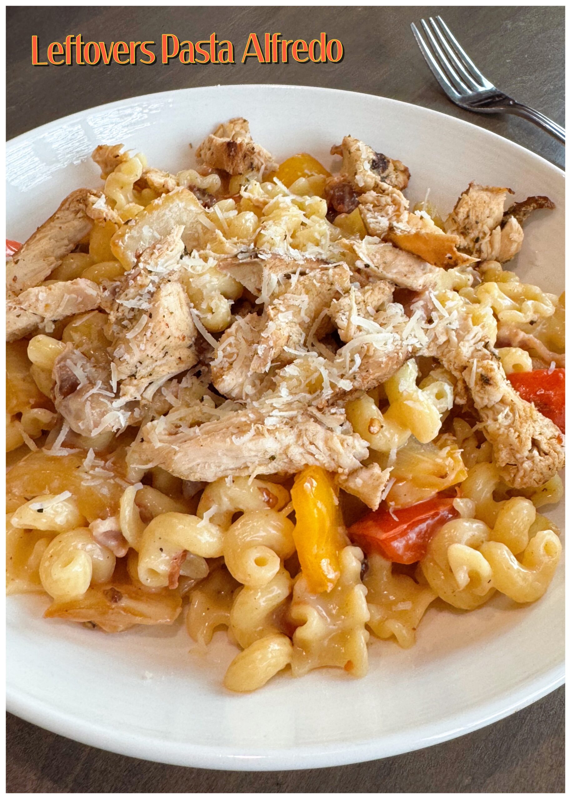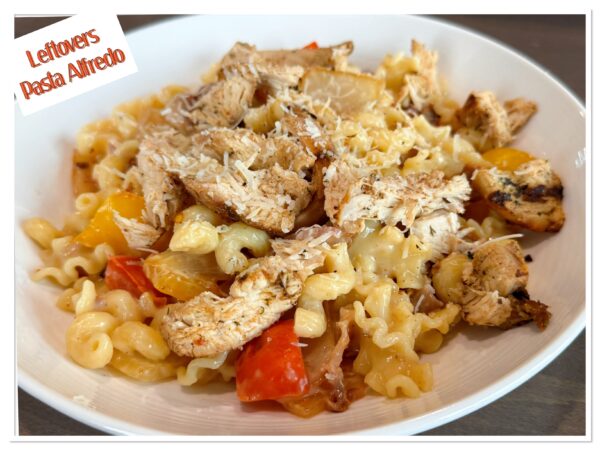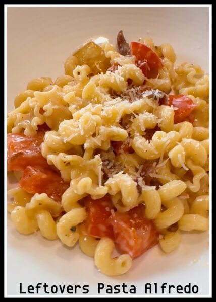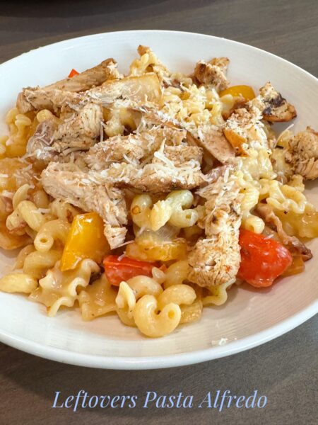 Saturday: Leftovers Pasta Alfredo FULL DISCLOSURE: I had an egg tortilla bake here but my family refused. Eggs are a “in the mood” kind of dinner lol. We opted for what we had in the cupboard and used up leftover veggies and chicken in the fridge.