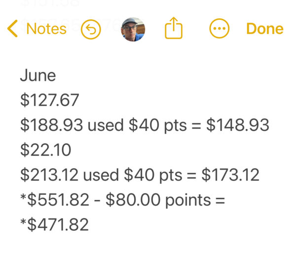 Ninja and I keep a running tab of all our grocery expenditures. This is our spending for June! We spent $551.82 but used $80.00 of points leaving our monthly spending at $471.82, clearly keeping to our budget and actually came in $228.18 under for the month, and so far we are under budget by $744.01 for the year!