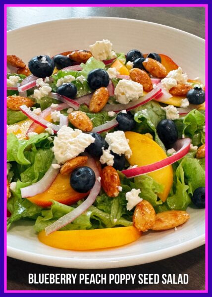 This Blueberry Peach Poppy Seed Salad was a light, refreshing, and delicious summer salad. We enjoyed the salad for dinner and then made it AGAIN and brought it for our contribution to dinner at my in-laws after a day in the pool and it was fresh, delicious, and everybody enjoyed it! I may make a batch of those nuts, just to snack on, they were so freaking good!