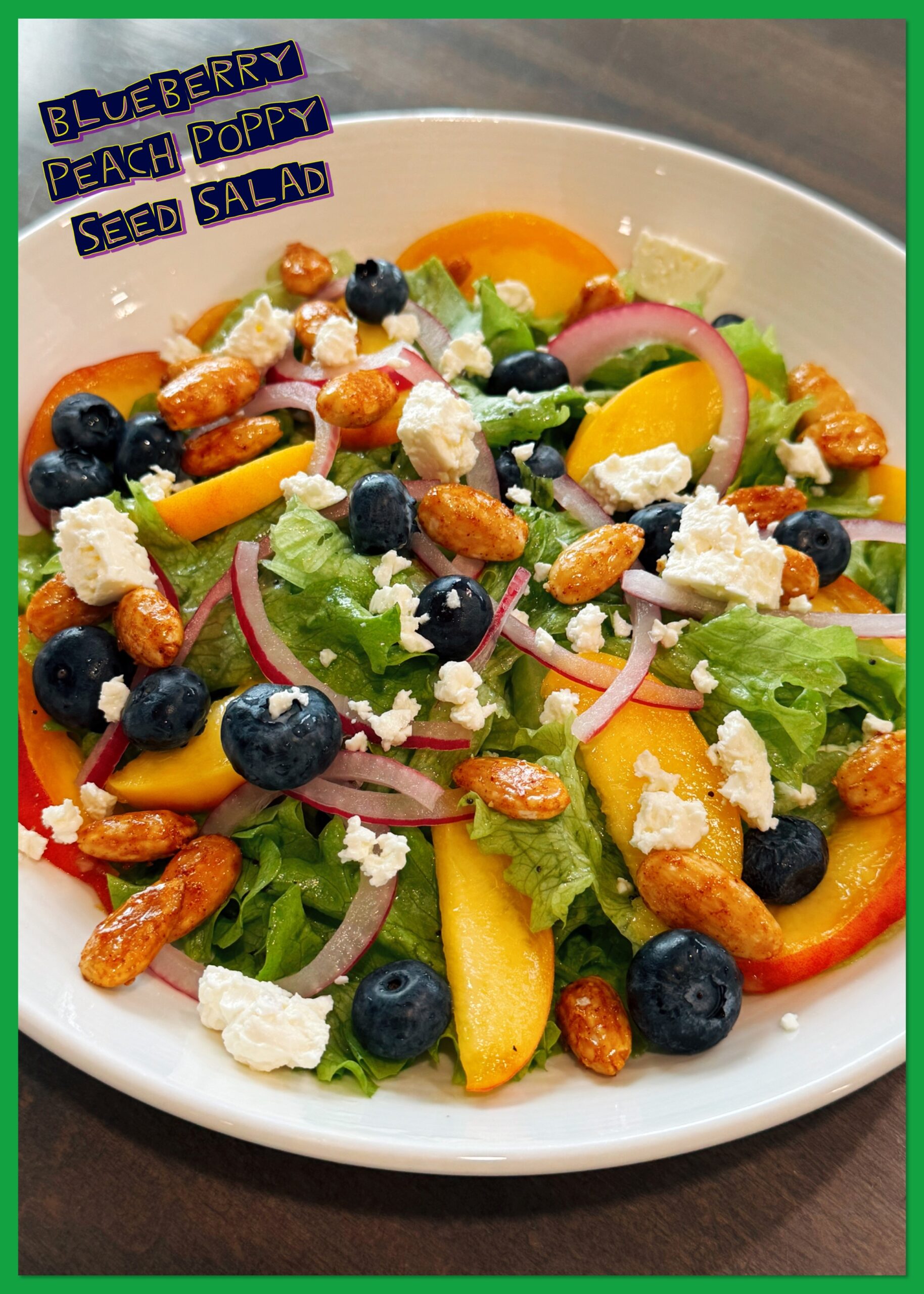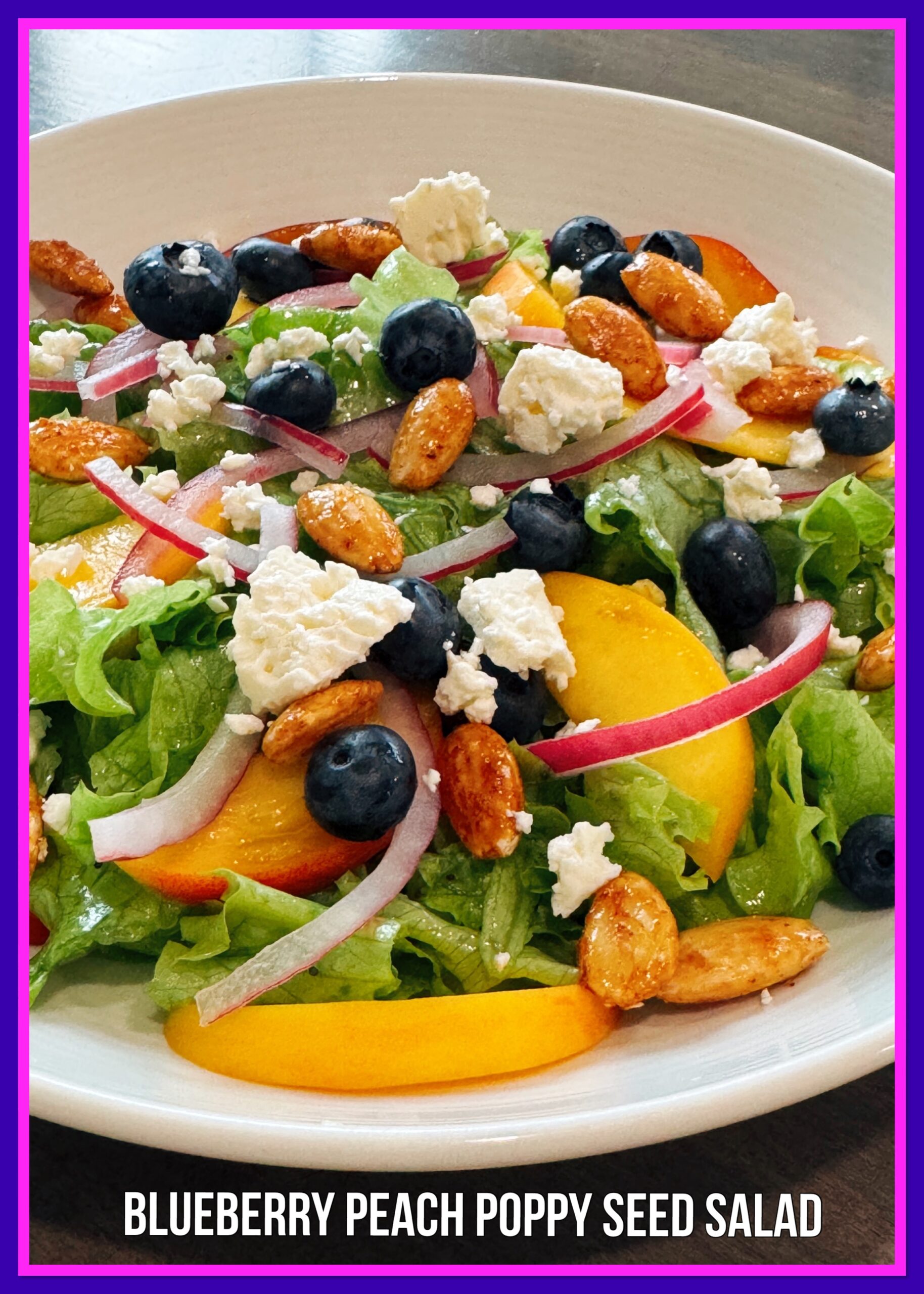 • Place lettuce in a large shallow bowl. Top with the peaches, blueberries, pickled red onions. Drizzle lightly with the dressing then sprinkle the candied almonds and feta cheese over the top.
