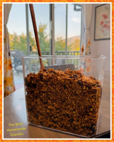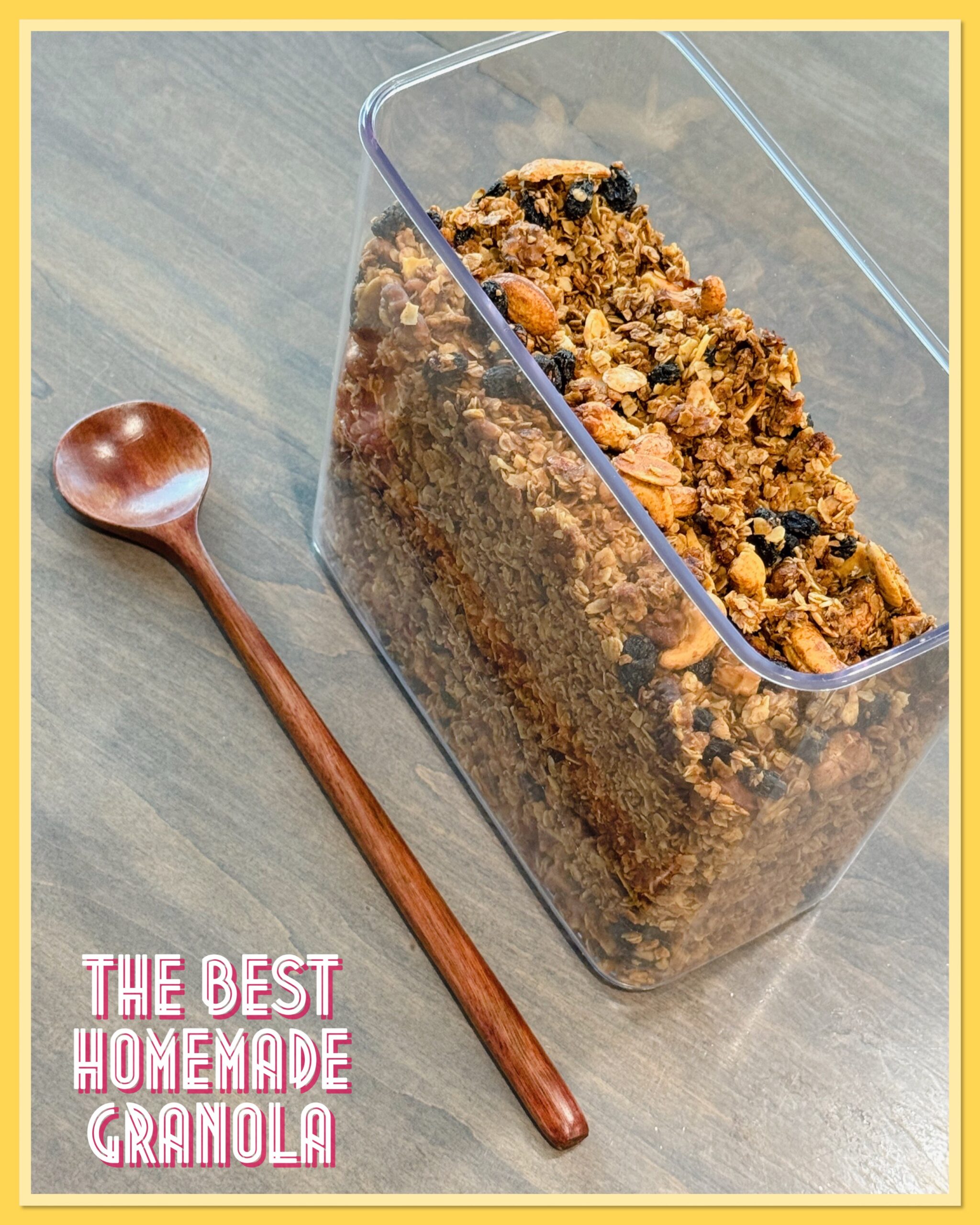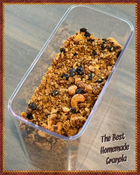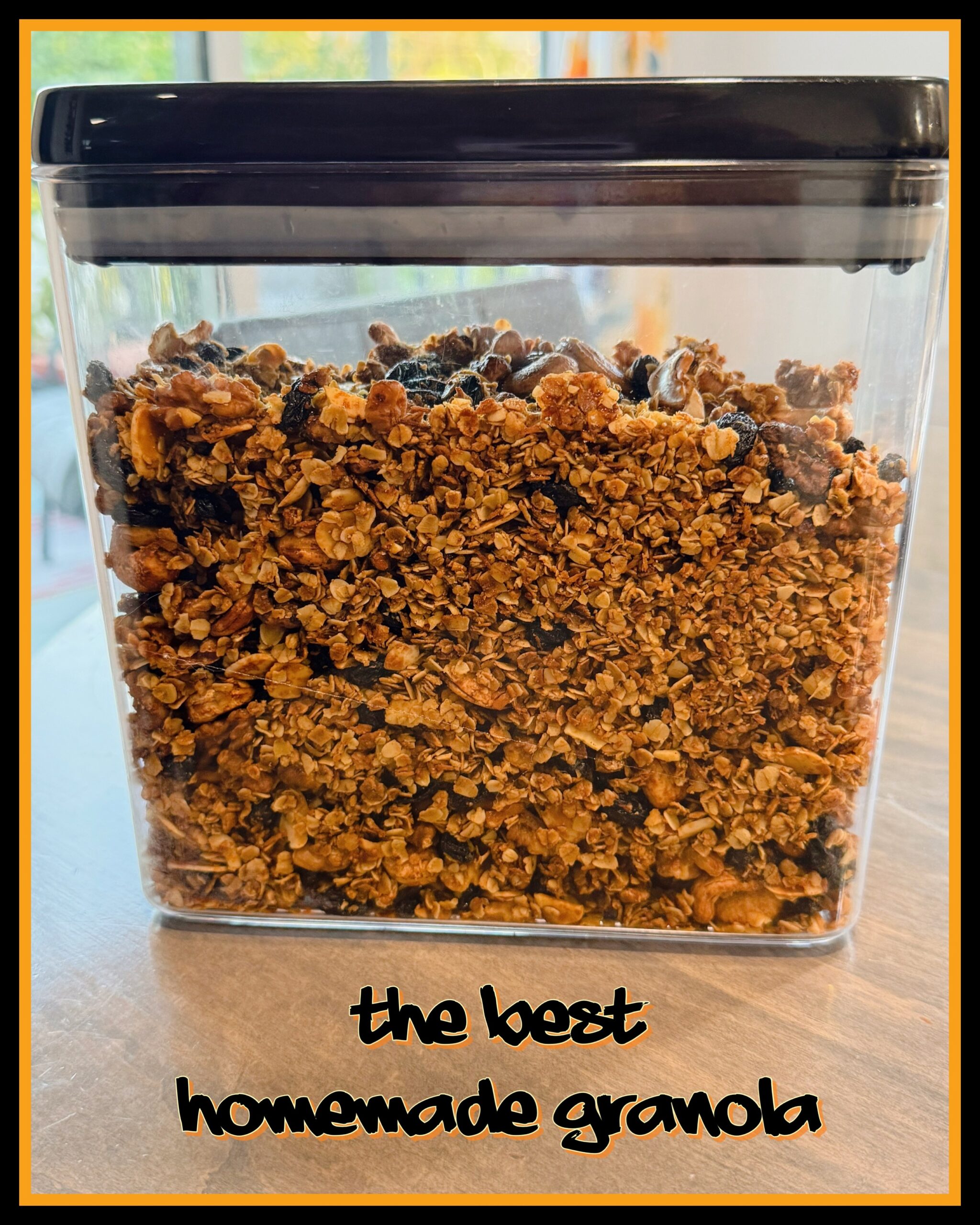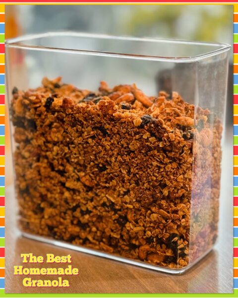 HBear asked for, granola. She loves granola by itself, on ice cream, or with yogurt. There are no nut allergies in her group so she picked out the nuts and helped me make The Best Homemade Granola as she says. I always put the raisins in before I bake it, but if you like them, chewy, add them at the end!