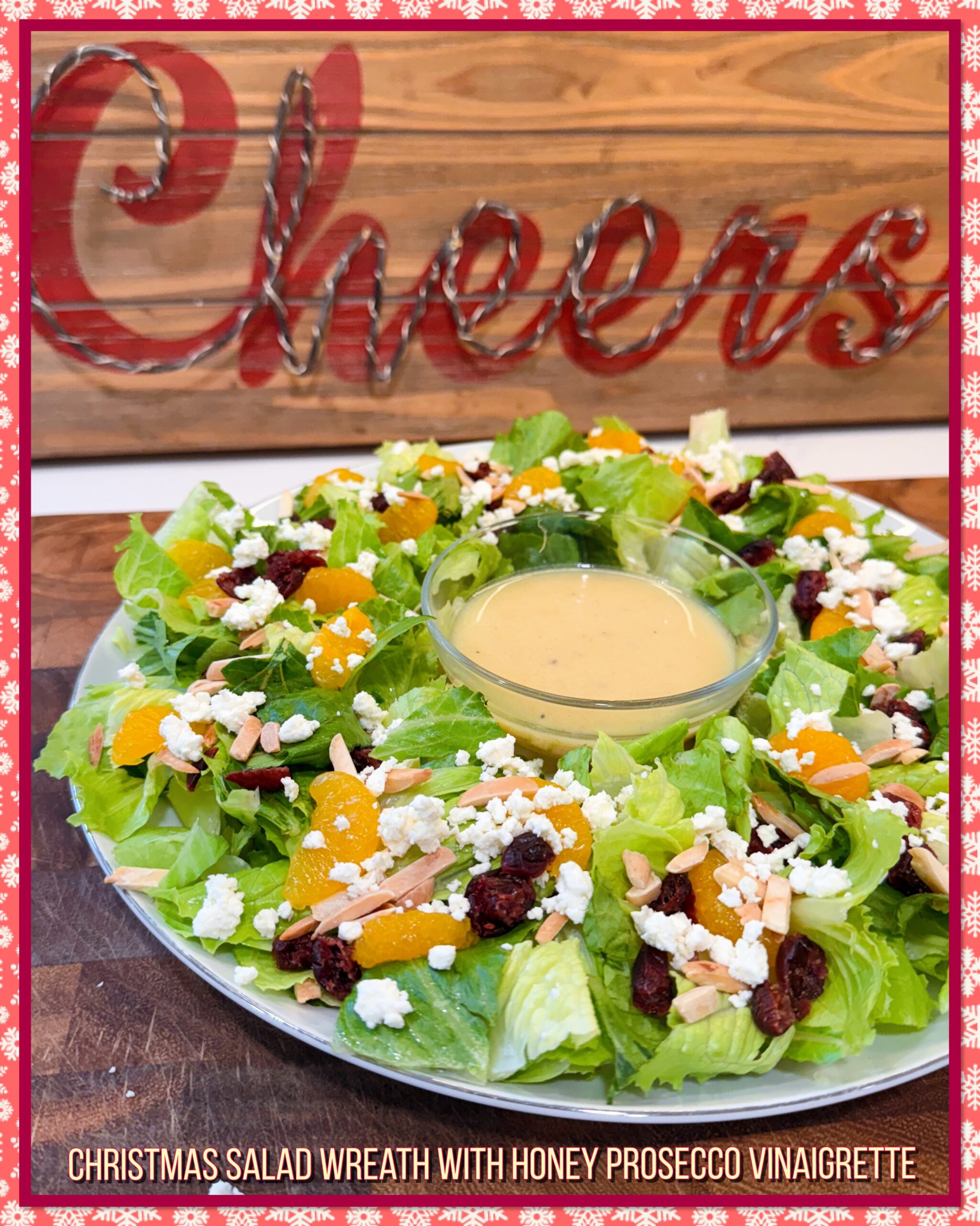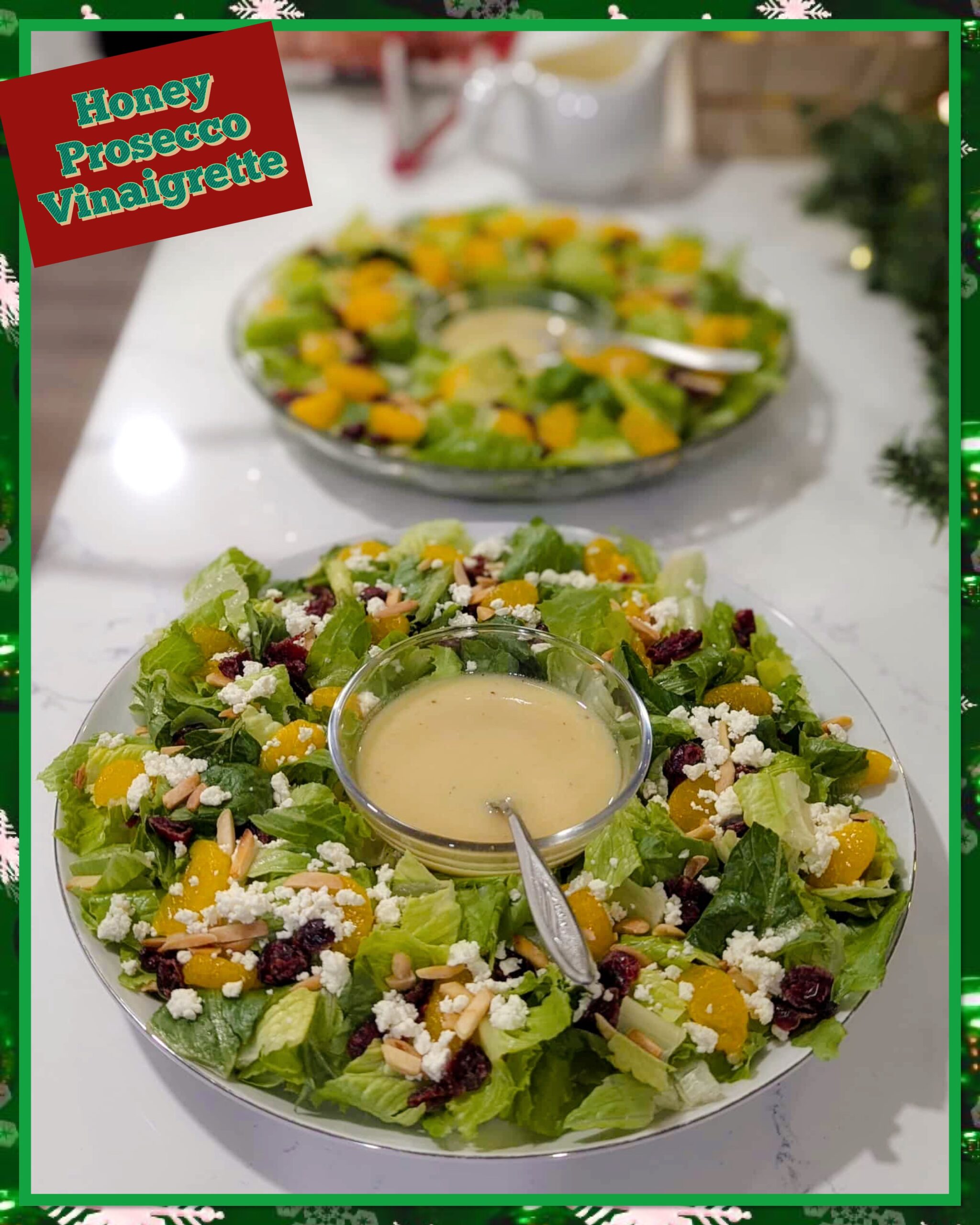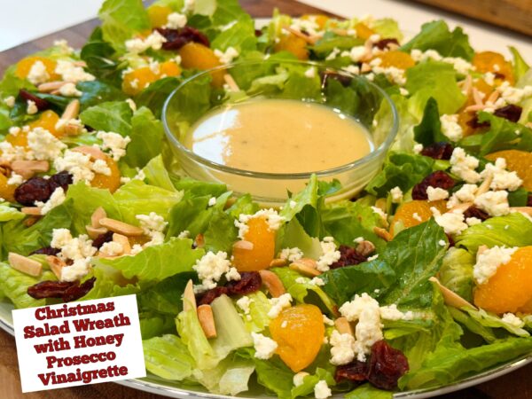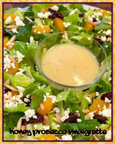 A few years ago, I made this Christmas Salad Wreath with my Mom’s go to vinaigrette. This year to do something different we made this Honey Prosecco Vinaigrette and it was so good! I love finding a new vinaigrette that I can make on the fly! It was a bit of an investment to buy the Prosecco vinegar, but I will be making this dressing again and again, all year long.