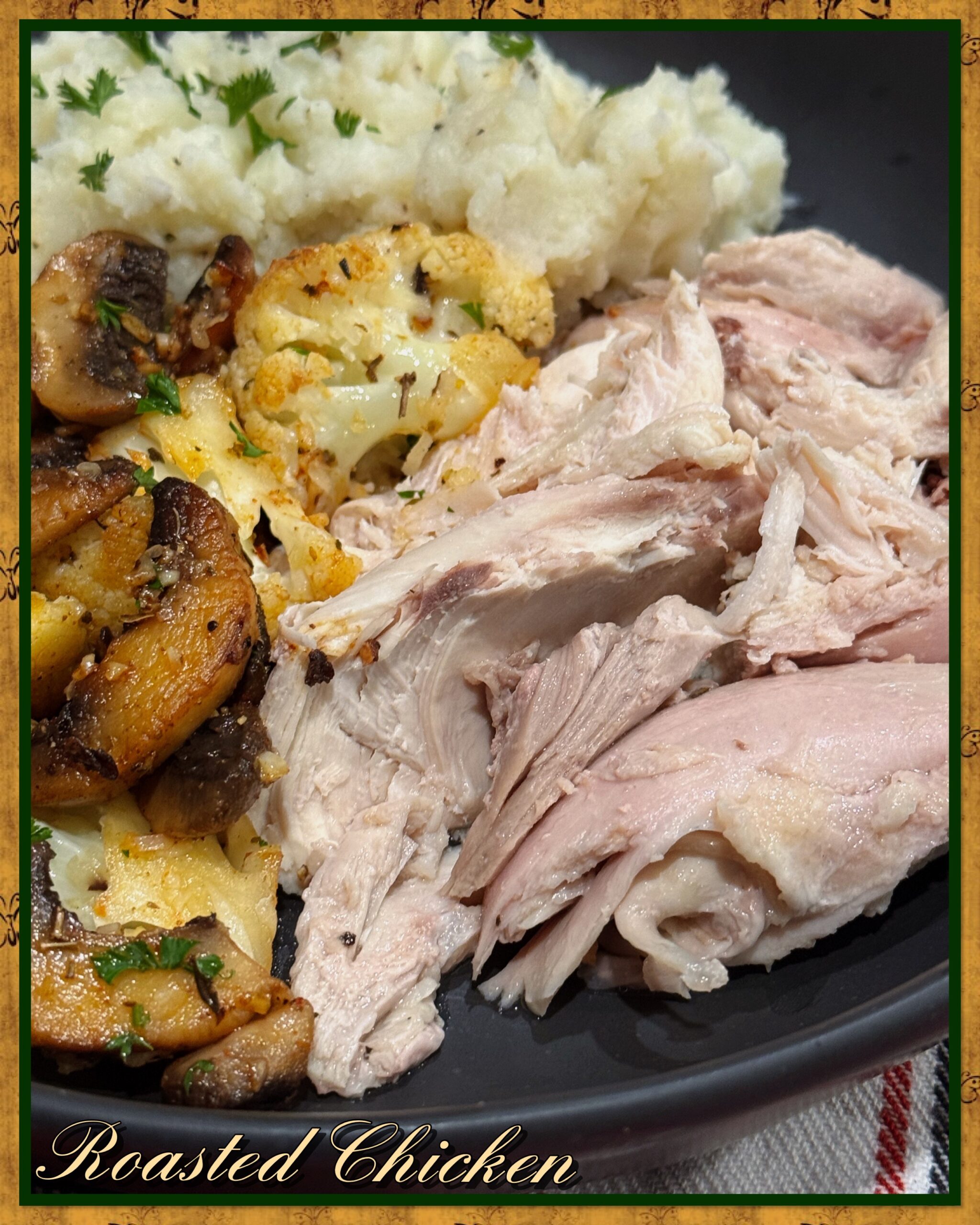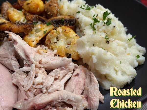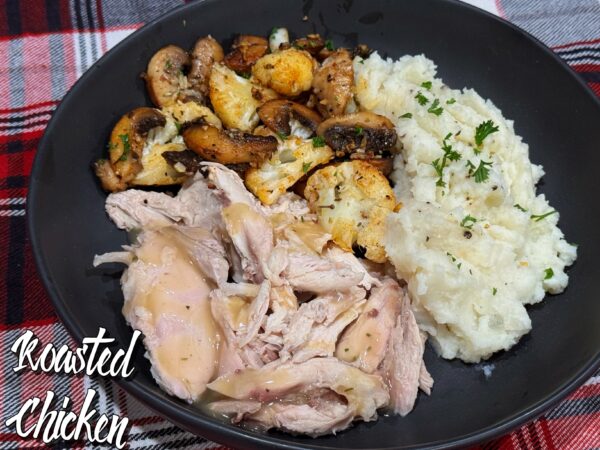 Ninja loves to roast a chicken on a Sunday afternoon so we can have a delicious dinner with yummy leftover chicken sandwiches for lunches throughout the week. This was a simple Roast Chicken dinner with this delicious and east Garlic Cauliflower Mushroom Skillet. This dinner is perfect right now because it’s warm and comforting, but also the flavours make you think, spring is right around the corner!